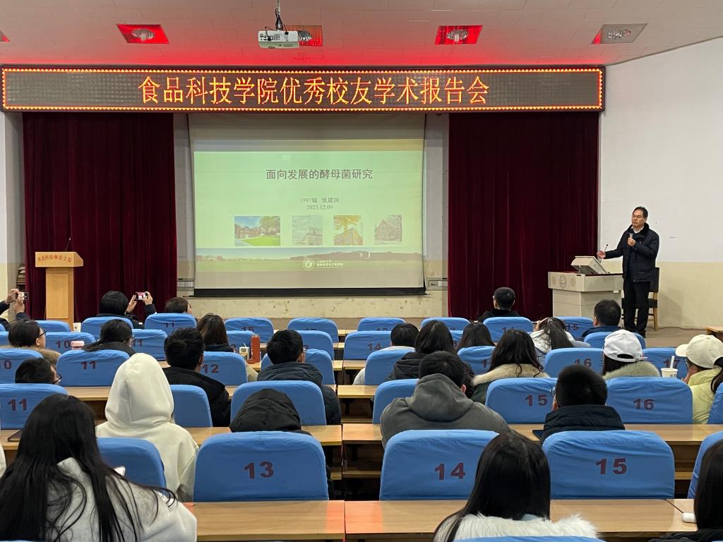 食品学院举办优秀校友学术报告会。食品科技学院邀请2001届校友、上海理工大学教授、博士生导师张建国教授为学院师生作题为“面向发展的酵母菌研究”的学术报告。学院领导班子、青年教师、辅导员(班主任)、全体研究生以及大二大二本科生聆听报告会。张建国教授结合自身的学习工作经历,深入浅出地对学生们进行专业指导。期间,张建国教授为学生答疑解惑,与学院青年教师进行了深入交流。(编辑:孙艳敏 审核:王荣加)
