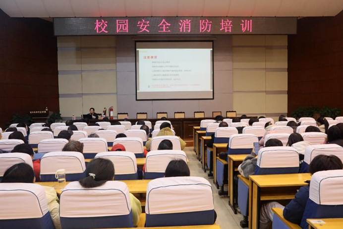 培训邀请属地消防救援中队消防员、消防技术服务公司一级注册消防工程师主讲。从火灾的基本常识、常见消防器材及使用入手,结合科普视频、现场实物、图文展示等对干粉灭火器、水基灭火器、二氧化碳灭火器、消火栓的灭火原理、适用火灾情形、注意事项进行详细讲解;针对校园火灾易发于教室、宿舍以及实验室情况,普及用火用电、火灾自救逃生常识。培训结合对火灾案例的剖析讲解,强化师生对校园火灾事故的主要原因、防范注意事项等的重视和理解。培训还对食堂加强燃气使用安全,防范火灾隐患,以及消防须知进行了教育普及。
