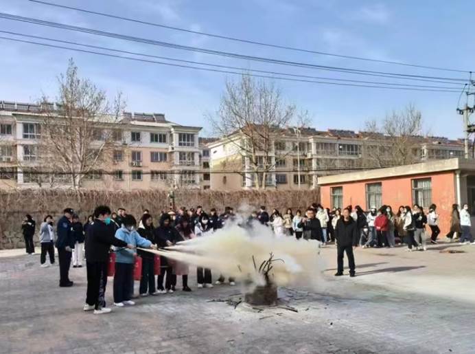 培训会后,安全工作处工作人员、属地消防救援中队的消防队员指导师生员工开展使用二氧化碳灭火器、消防水带水枪灭火、模拟火场应急逃生的实操演练活动。
