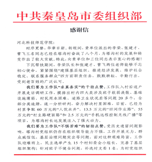 近日,中共秦皇岛市委组织部向我校发来感谢信,对我校派出的下沉干部工作队李荣、张建才、曹飞三名同志在工作期间为塔沟村的发展和转变作出的较大贡献表示衷心的感谢!