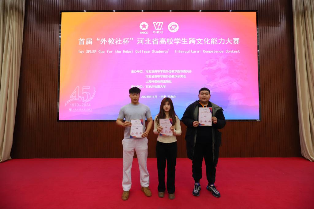 近日,首届“外教社杯”河北省高校学生跨文化能力大赛在石家庄铁道大学圆满落幕。我校外国语学院学生卢洪洋,体育与健康学院李瑛钦、韩一冉同学组成的参赛队伍,在比赛中表现优秀,荣获三等奖。
