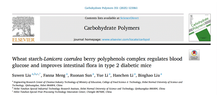 近日,我校食品科技学院刘素稳教授课题组在《Carbohydrate Polymers》(中科院1区Top期刊,IF=10.7)发表了题为“Wheat starch-Lonicera caerulea berry polyphenols complex regulates blood glucose and improves intestinal flora in type 2 diabetic mice”的最新研究成果。该成果得到国家自然科学基金青年基金(32101952)、河北省自然科学基金杰出青年科学基金(C2024407033)、河北省自然科学基金面上项目(C2023407040)资助和板栗产业技术教育部工程研究中心的支持。(编辑:孙艳敏 审核:王荣加)