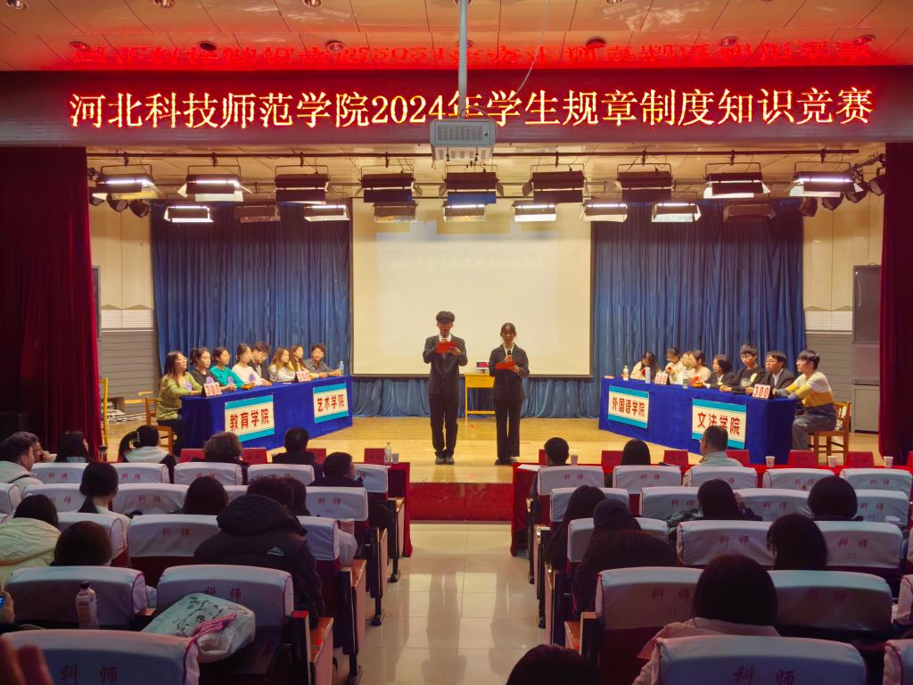 2024年12月5日,我校分别在秦皇岛、昌黎、开发区校区学术报告厅举办2024年学生规章制度知识竞赛。校党委常委、副校长冯瑞银,学生处负责人,各学院学生工作主管领导,有关辅导员(班主任),2024级新生代表等1000余人观看了比赛。