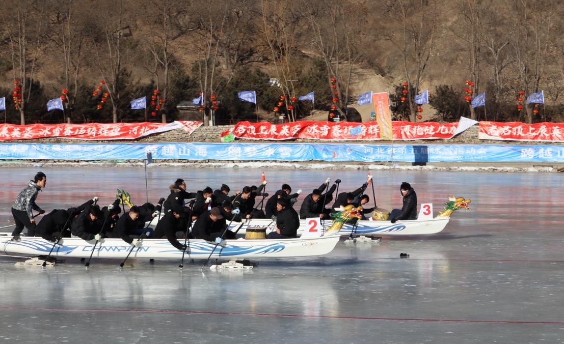 2025年1月7日、8日,河北省第五届冰雪运动会冰上龙舟项目在秦皇岛市老君顶冰雪王国开赛。我校派出了由体育与健康学院教师和50余名学生组成的龙舟代表队参加了本次比赛。