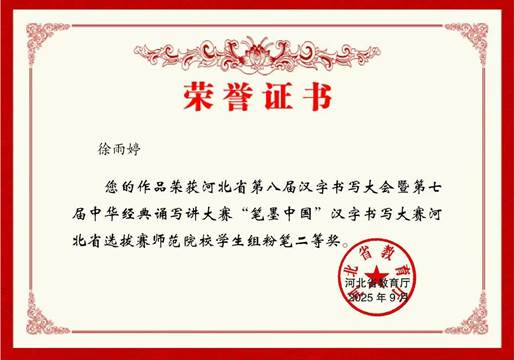 日前,从河北省第八届汉字书写大会暨第七届中华经典诵写讲大赛“笔墨中国”汉字书写大赛河北省选拔赛的结果获悉,我校师生表现优异,斩获多项荣誉。余青烨、吴紫璇等2名同学荣获大学生硬笔书写组二等奖;陈思雨(小学教育专业)、黄承奕、陈思雨、王超文等4名同学荣获大学生硬笔书写组三等奖;徐雨婷同学获师范院校学生组粉笔书写二等奖;胡子彤、于欣两位同学分获师范院校学生组粉笔书写优秀奖;王瀚茁、滕梓怡同学在大学生组诵读比赛中分获二、三等奖;周丽娟老师荣获教师组粉笔书写一等奖。此外,余青烨、吴紫璇、徐雨婷等同学以及周丽娟老师的共7份优秀作品,经组委会遴选推荐参加全国总决赛。