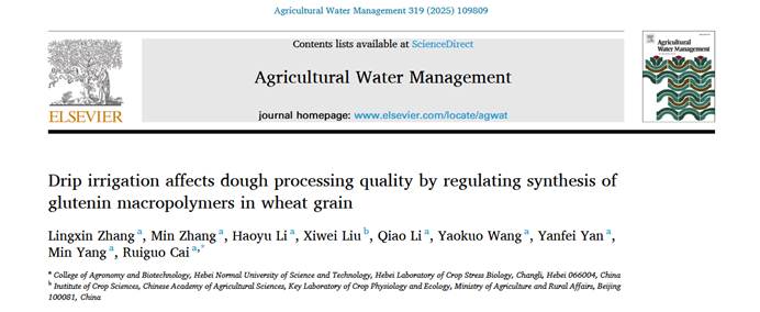 近日,我校农学与生物科技学院小麦创新团队的蔡瑞国教授在“Agricultural Water Management”(中科院一区,IF=6.5)发表了题为“Drip irrigation affects dough processing quality by regulating synthesis of glutenin macropolymers in wheat grain”的研究论文。2025届植物学硕士研究生张灵鑫为论文第1作者,蔡瑞国教授为通讯作者,农学与生物科技学院为论文第1完成单位,该成果得到了河北省自然科学基金面上项目(C2022407015)的资助。