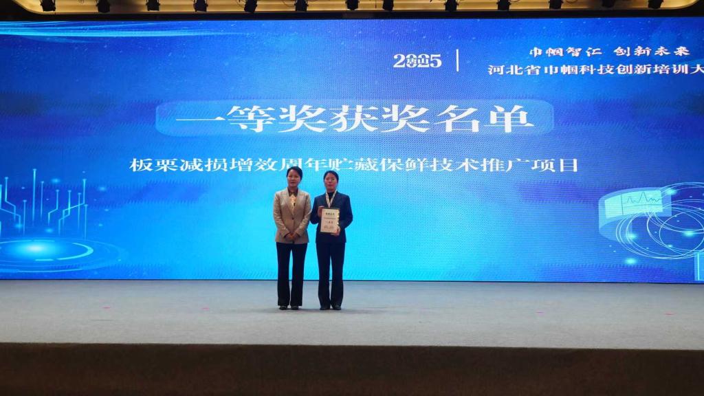 2025年10月10日,由河北省妇女联合会、河北省科学技术协会联合主办的“巾帼智汇 创新未来”河北省巾帼科技创新培训大赛在唐山南湖国际会展酒店圆满收官。经全省127个参赛项目的激烈角逐,食品科技学院教师赵玉华携“板栗减损增效周年贮藏保鲜技术推广项目”摘得唯一一等奖桂冠,其技术成果为燕山板栗产业注入强劲科技动能。