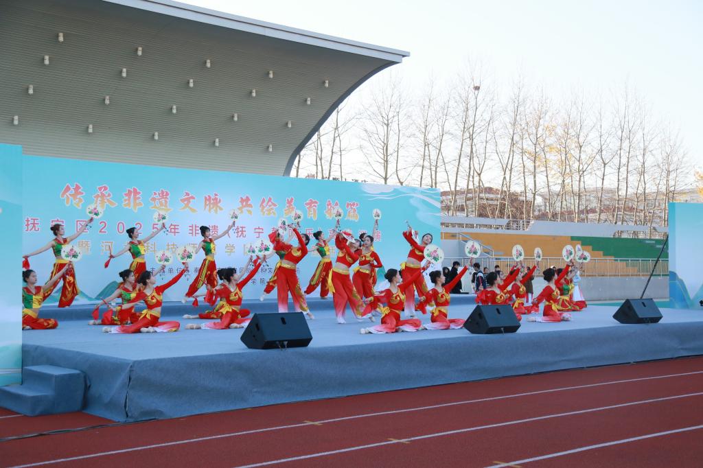 鼓点铿锵震校园,乐舞悠扬润心田。2025年11月9日下午2:30,金沙67783检测路线开发区校区运动场上乐声欢快、掌声如潮。由秦皇岛市抚宁区旅游和文化广电局与金沙67783检测路线艺术学院联合主办的“二〇二五非遗进高校暨美育实践活动”在此盛大启幕。这场汇聚国家、省、市、区四级非遗项目的文化盛宴,以“传承非遗文脉 共绘美育新篇”为主题,让千余名师生沉浸式感受了抚宁非物质文化遗产的独特魅力,为校园美育实践写下了生动注脚。
