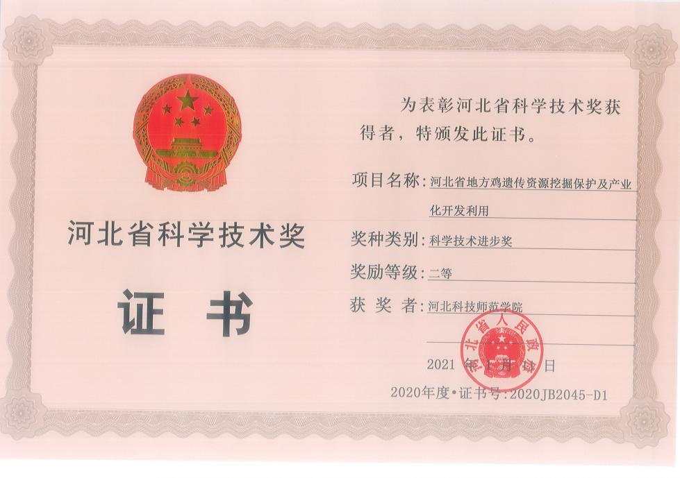 和全方位保护;挖掘到产蛋、抗病、生长发育、羽色和羽速相关基因资源,创建的羽速分子选育技术显著提高选种效率并缩短育种进程;研发的繁育、养殖、疫病防控、产品包装等关键技术促进了特色资源产业化开发利用。成果发表81篇论文,其中SCI收录13篇,三类高质量论文10篇;授权发明专利5项,实用新型专利2项,软件著作权1项,地方标准5项;培养博士2人、硕士15人,培训指导基层农技人员和养殖户2万余人次。成果促进了蛋鸡产业绿色高质量发展,有效提升了蛋鸡产业科技创新能力和市场竞争力,实现了特色资源以保为先、以用促保和保用结合。成果先后被河北电视台、河北日报、河北经济日报、秦皇岛日报和秦皇岛电视台宣传报道。