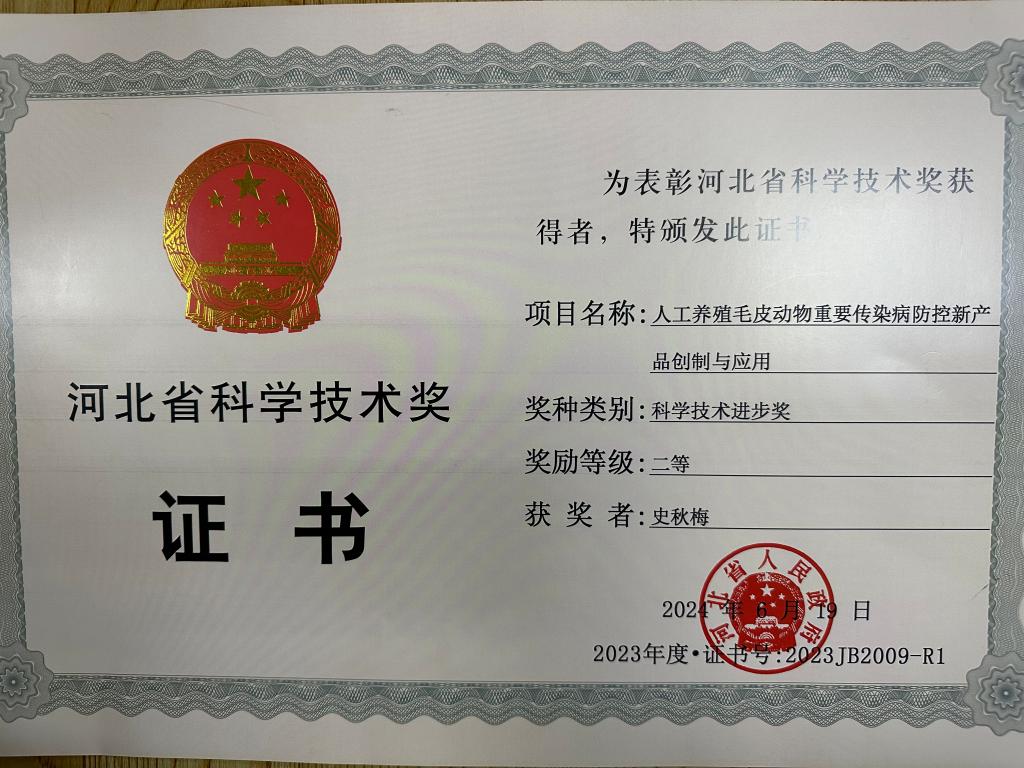成果获国家新兽药证书2个,授权专利24件,软著21件,开发高新技术产品2个,主推技术6项,发表论文128篇,培训人员21万人次。创制的国家新兽药、发明的系列中兽药、微生态制剂有效的控制了我国毛皮动物重要传染病的发生,保障了河北省毛皮动物健康、绿色、高效发展。
