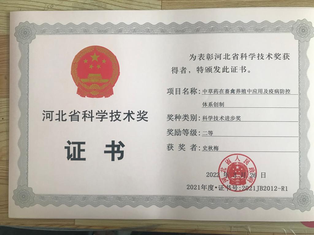 科技奖励:1.中草药在畜禽养殖中应用及疫病防控体系创制