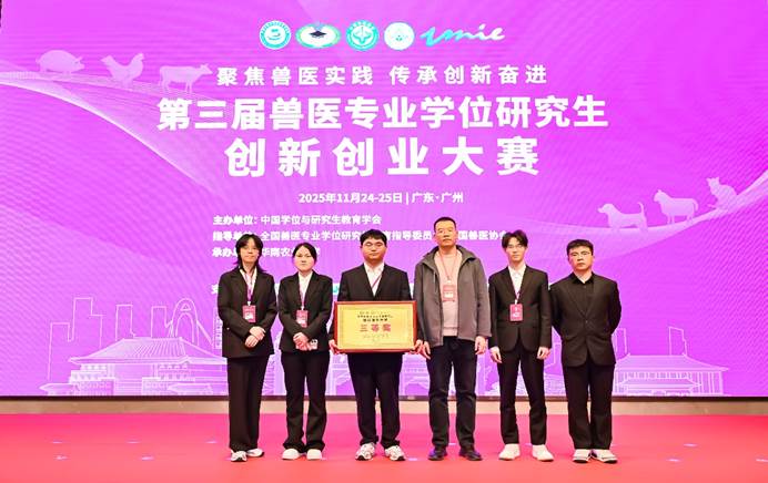 2025年11月24日至26日,第三届兽医专业学位研究生创新创业大赛在广州举行。我校动物科技学院兽医专业硕士研究生赵秋旖、马志勇、姜帅宇、郭宽嘉、陈甜甜5名同学组成的“科师硕博”团队,以“大动物连锁医院‘1+3’基层兽医服务新模式”为题参加创业组比赛,荣获大赛三等奖。方玉鹏博士和付志新副教授担任大赛的指导老师。