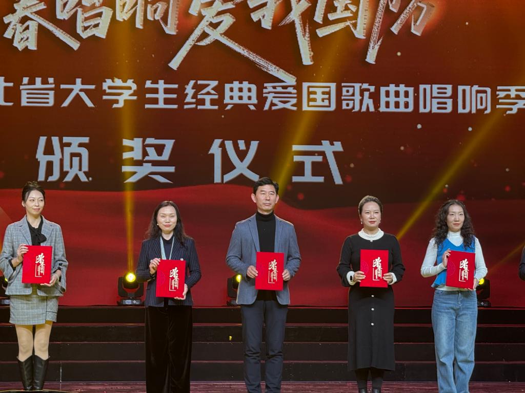 近日,由河北省委宣传部、河北省军区政治工作局指导,省国防动员办公室、省教育厅等多部门联合主办的“青春唱响·爱我国防”2025河北省大学生经典爱国歌曲唱响季活动圆满落幕。我校艺术学院麦兜兜合唱团凭借精湛的艺术表现脱颖而出,不仅助力学校斩获“优秀组织奖”,参演的三首作品更喜获两项一等奖、一项二等奖的优异成绩。合唱团师生受邀赴石家庄参加集中展演与颁奖典礼,用青春之声在燕赵大地传递家国情怀。