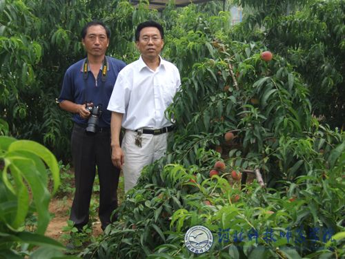 图为副院长王同坤教授与齐永顺教授在我校培育的桃新品种“秦红”前留影