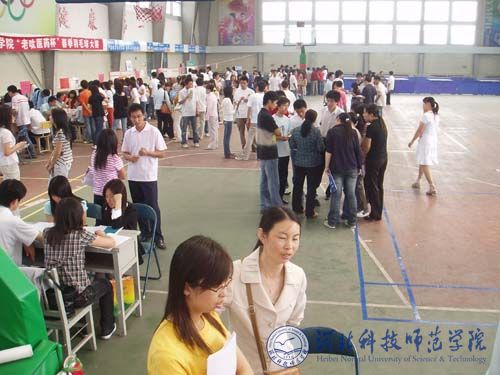 2008年6月8日,我校动物科学系毕业生就业洽谈会在昌黎校区体育馆举行。来自北京、石家庄、保定、唐山、秦皇岛等地的35家用人单位和动物科学系163名毕业生及240余名即将开始生产实习的大三学生参加了洽谈会,我校化学系、生命科学系等各系的部分毕业生也闻迅赶到洽谈会现场。