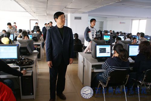 图为党委副书记、院长汤生玲同志在我校欧美学院电子阅览室考察