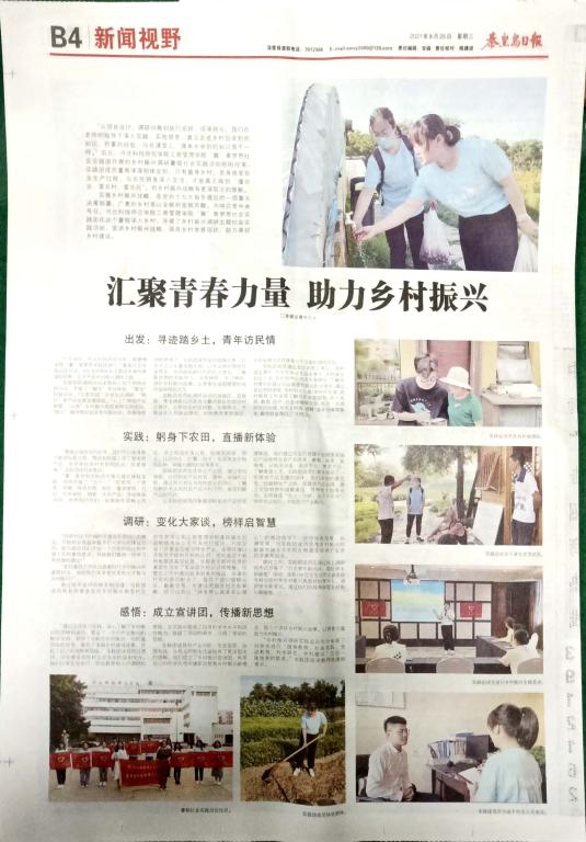 2021年8月25日,《秦皇岛日报》B4版整版,以《汇聚青春力量 助力乡村振兴》为题,报道了我校“冀”青梦想社会实践团成员在赵敏书记、韩晓霞副书记和姚建树老师的带领下以线上线下相结合的方式开展乡村振兴调研助力乡村振兴的情况,全文如下:
