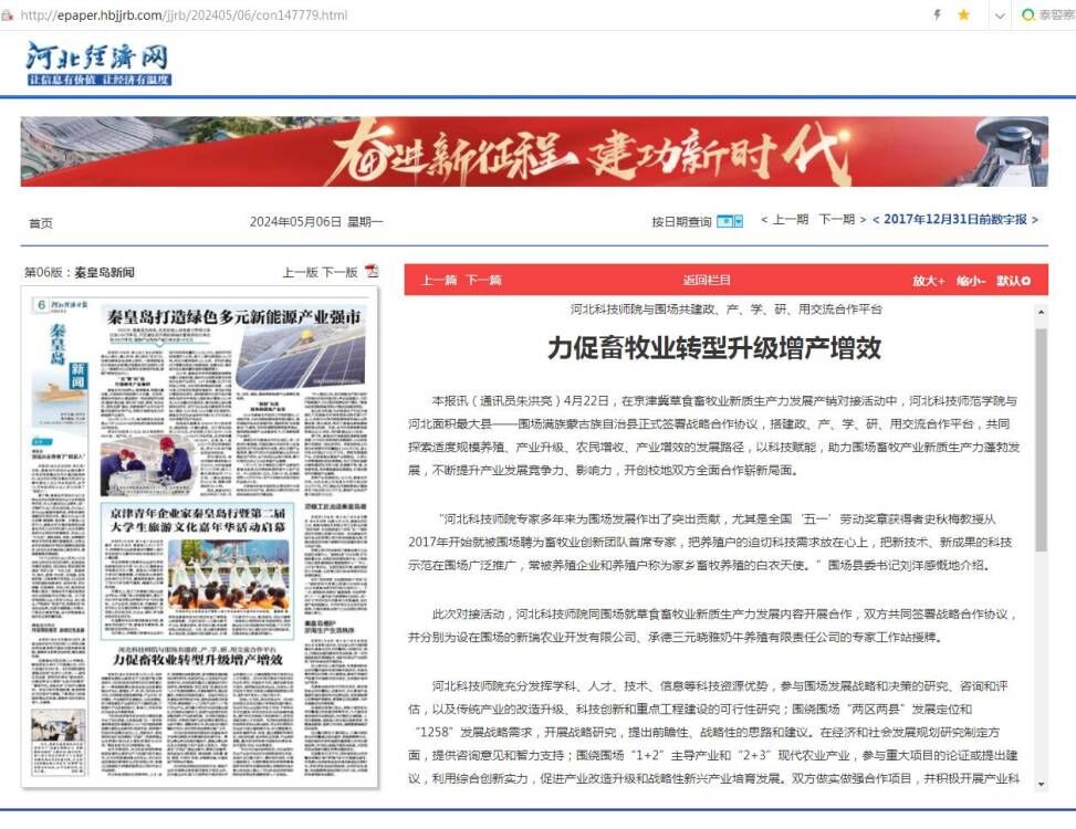2024年5月6日,《河北经济日报》第六版刊登我校与承德市围场满族蒙古族自治县校地合作促发展情况。《河北经济日报》原文如下: