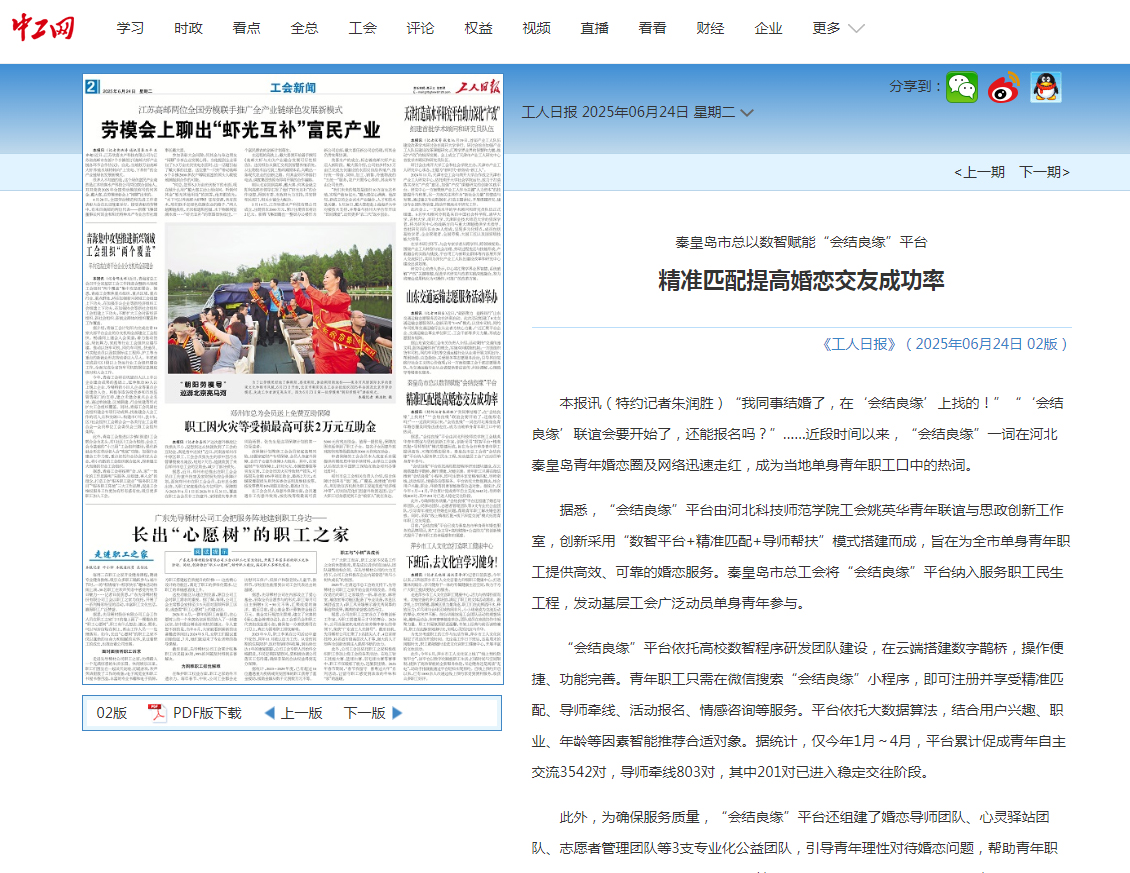 2025年6月24日,《工人日报》、中工网第二版,工会新闻版以“秦皇岛市总以数智赋能‘会结良缘’平台,精准匹配提高婚恋交友成功率”为题,对我校工会姚英华青年联谊与思政创新工作室,创新采用“数智平台+精准匹配+导师帮扶”模式塔建婚恋交友平台,为全市单身青年职工提供高效、可靠的婚恋服务情况进行了宣传报道。