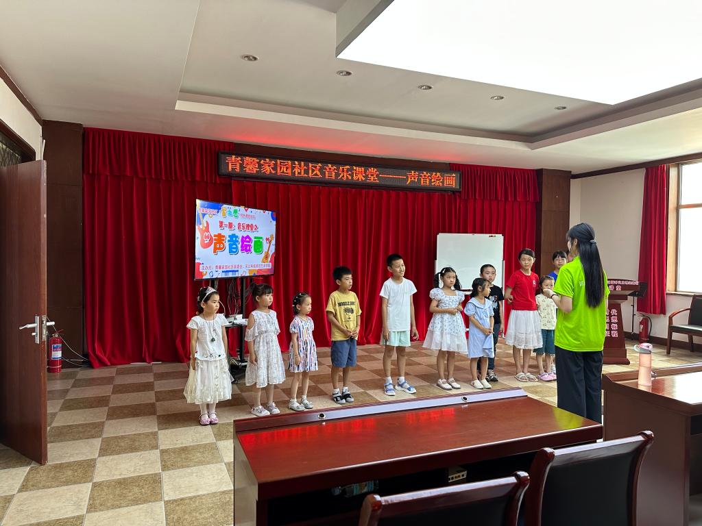 在青馨家园和华苑馨居,活动的主要对象是少年儿童,主要围绕音乐课堂、美术课堂两个方向开展。音乐课堂上,实践队员带领孩子们唱歌,跳舞,弹琴,为他们讲授基本的乐理知识,先后开展了音乐分享会、音乐游戏、音乐沙龙、音乐表演等系列活动,有效提升了孩子们对音乐的感知和理解能力。