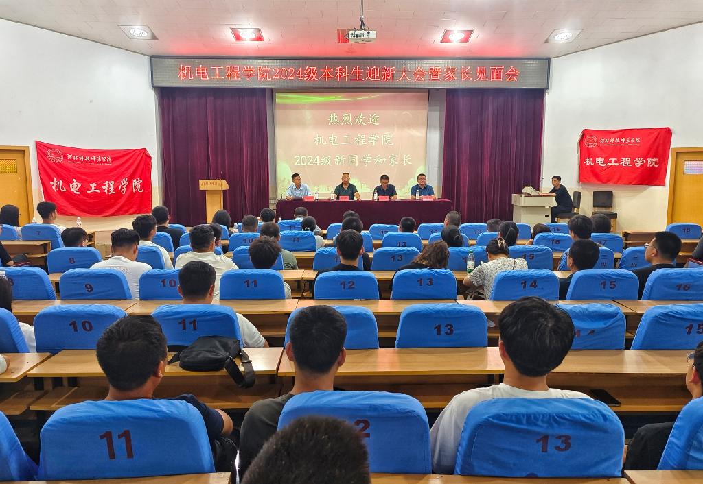 2024年9月3日,机电工程学院在昌黎校区报告厅采取线上线下同步进行的方式,举办了2024级本科生迎新大会暨家长见面会。学院领导班子、专业负责人、教学部主任、辅导员、班主任以及2024级新生及家长共计470人参加会议。