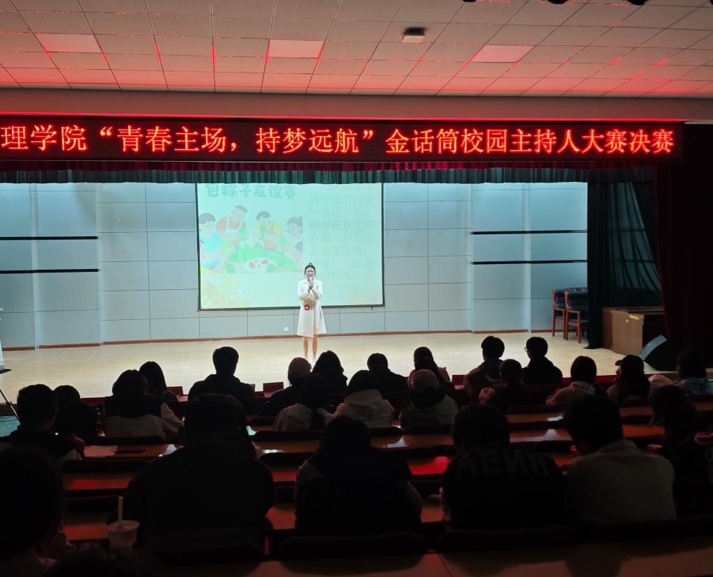 2025年4月10日,为丰富校园文化生活,挖掘学生主持潜能,展现青年学子昂扬向上的精神风貌,工商管理学院在秦皇岛校区多功能厅举办“青春主场 持梦远航”金话筒主持人大赛决赛。经过激烈角逐,10名选手从初赛中脱颖而出,用声音传递青春力量,学工办老师及200余名学生参加此次活动。