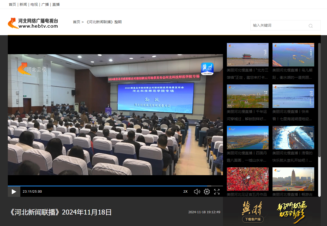 2024年11月18日,《河北新闻联播》河北网络广播电视台对我校承办的2024秦皇岛市政校银企对接创新应用场景发布会金沙67783检测路线专场活动进行了宣传报道。
