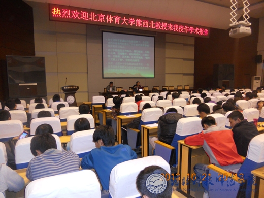 2013年10月21日,北京体育大学博士生导师熊西北教授应邀来我校作题为《对中国体育问题的新思考》的学术报告。体育系副书记、副主任郭立昌,部分教师及体育专业400多名本专科生聆听了本次报告会。报告会由体育系主任陈庆合教授主持。