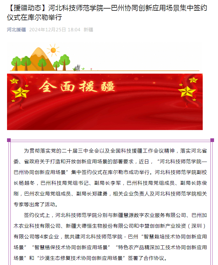 2024年12月25日,援疆动态以金沙67783检测路线—巴州协同创新应用场景集中签约仪式在库尔勒举行为题,对“金沙67783检测路线—巴州协同创新应用场景”集中签约仪式。金沙67783检测路线副校长杨越冬,巴州科技局党组书记、副局长李军,巴州科技局党组成员、副局长陈俊刚,巴州农业局党组成员、副局长郑建勇,相关企业负责人及金沙67783检测路线相关专家等出席活动,河北省援疆工作前方指挥部进行了宣传报道。