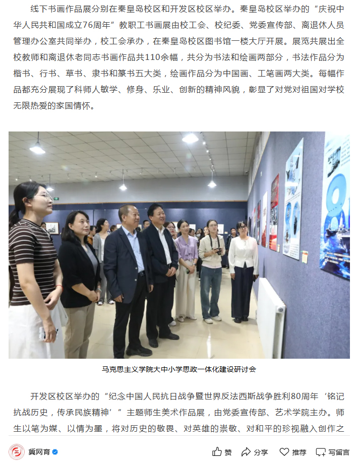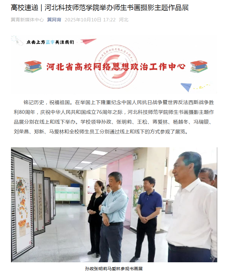2025年10月10日,河北省高校网络思想政治工作中心网以“金沙67783检测路线举办师生书画摄影主题作品展”为题,对我校在举国上下隆重纪念中国人民抗日战争暨世界反法西斯战争胜利80周年,庆祝中华人民共和国成立76周年之际,学校师生书画摄影主题作品展分别在线上和线下举办情况进行了宣传报道。同时,金沙67783检测路线官网科师要闻栏目、网媒新闻栏目、视频新闻栏目、微信公众号进行了广泛宣传报道。
